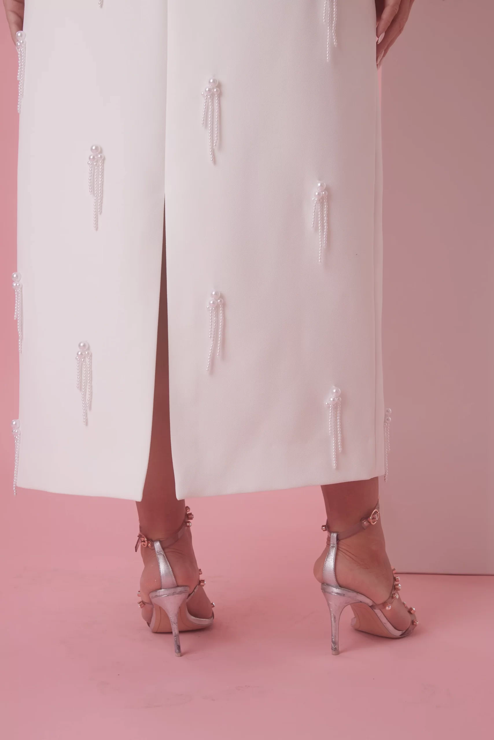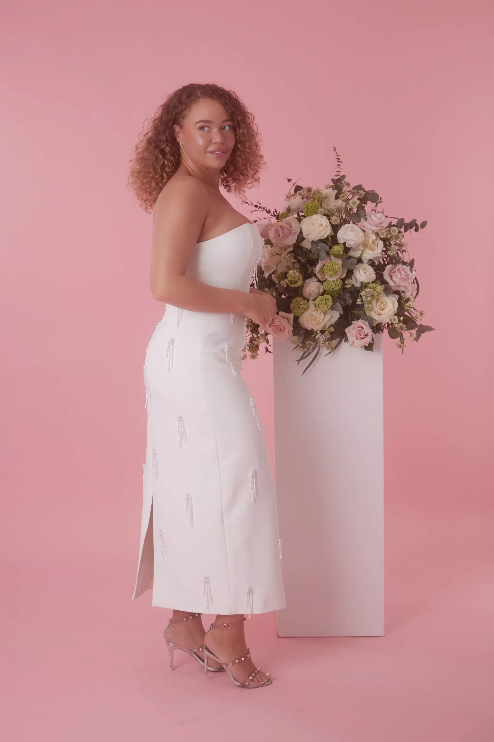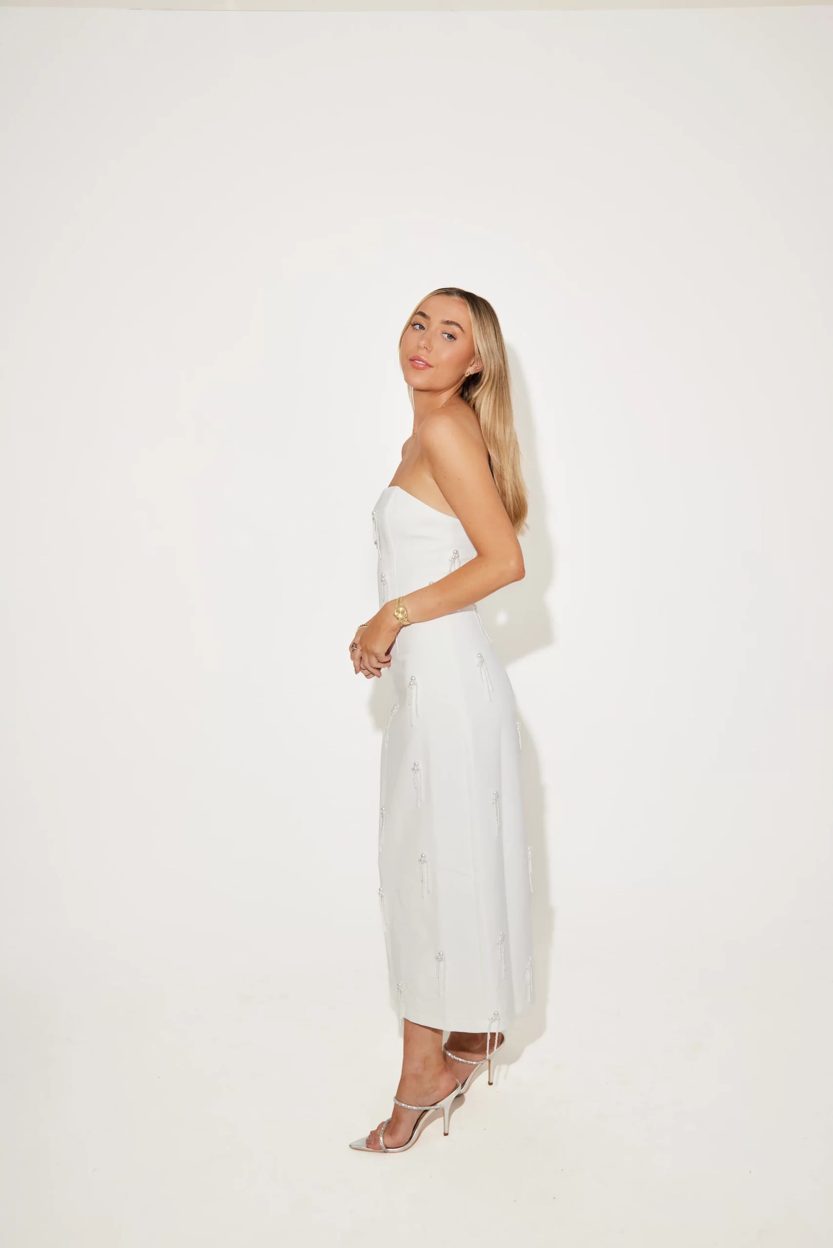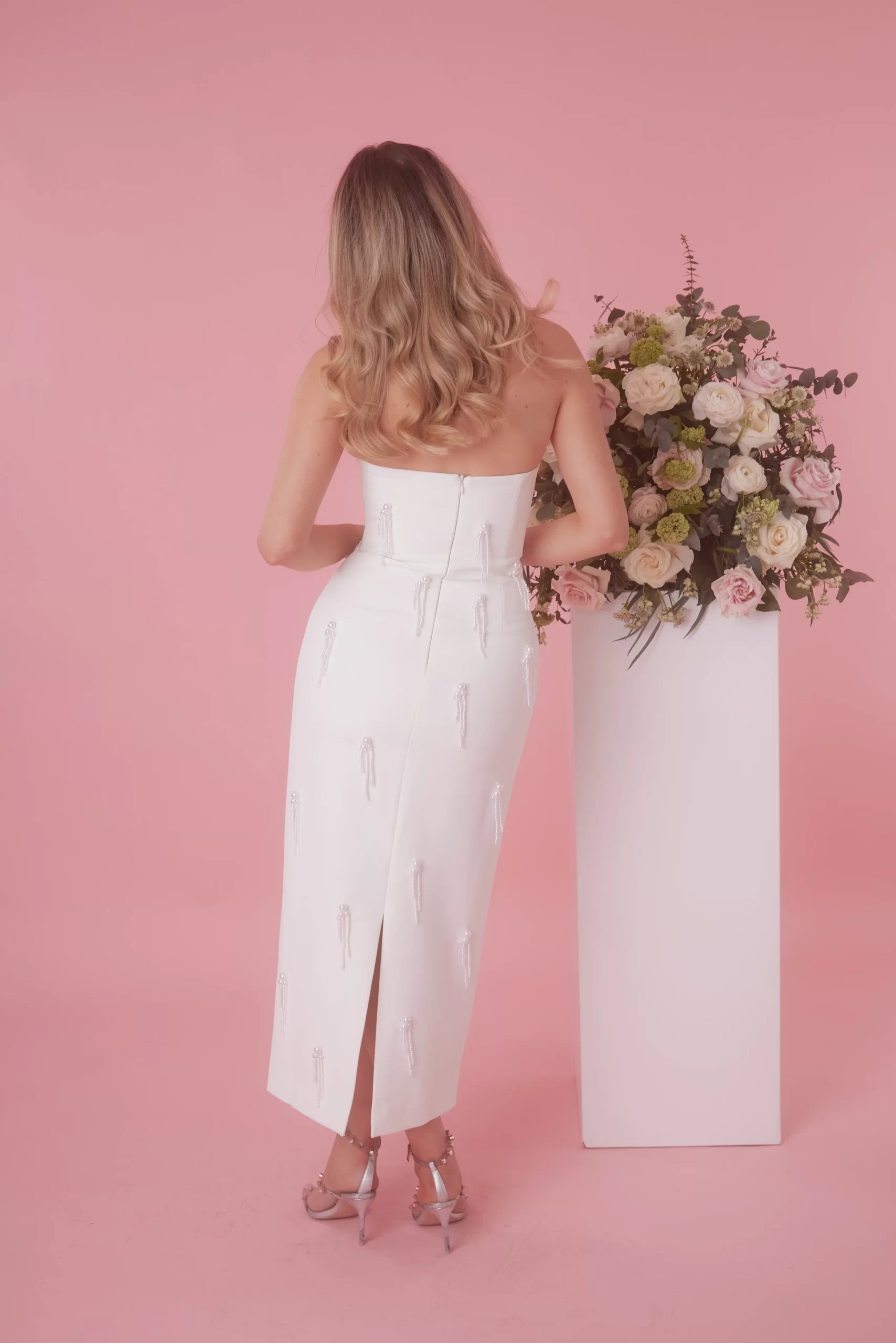 Cut from our long-adored signature fabric, the evolution of the pearls continues to offer timeless elegance to our brides-to-be. Adorned with delicate dropping pearl embellishments from back to front, this sharp strapless, crisp white piece delicately hugs the figure. Designed in-house, especially for our brides, let us be your ‘something new’ that you will love for a lifetime.