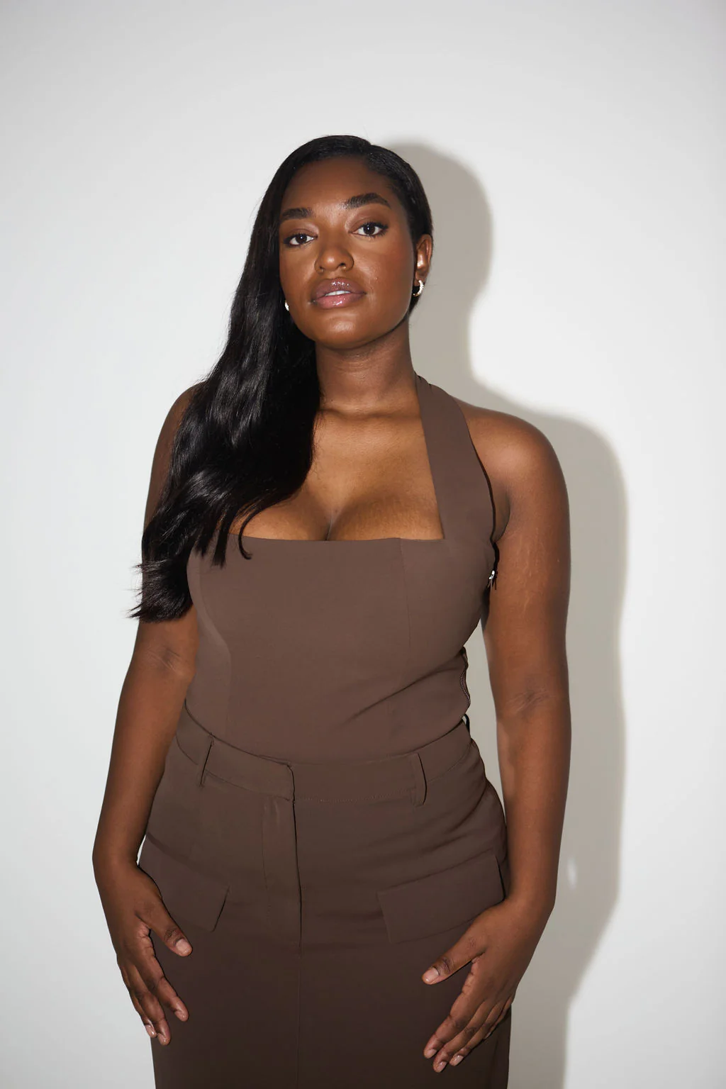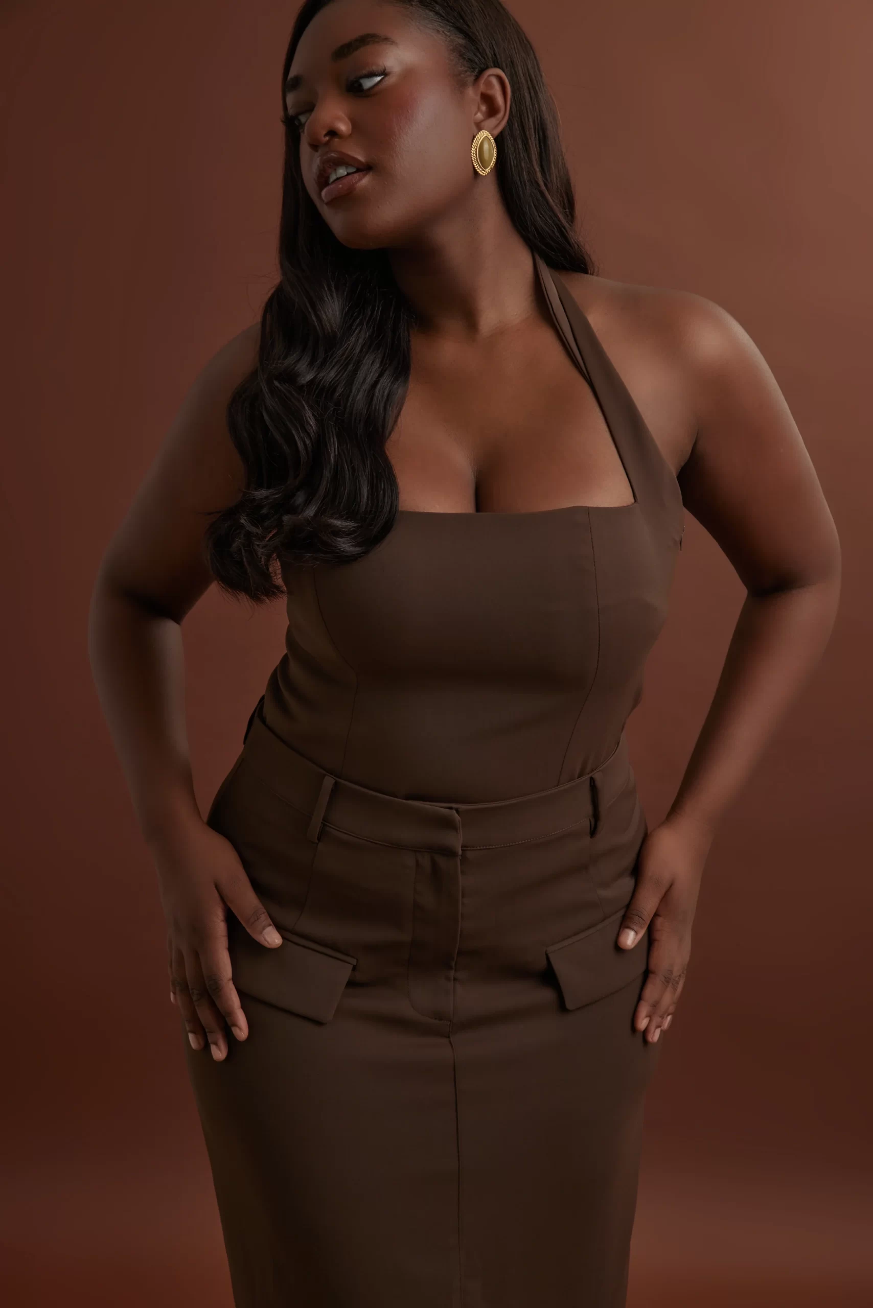 Your fall favourites sorted. Enter, the classic halter neck silhouette with an Odd Muse touch. This simplistic yet sartorial statement is defined by its structured silhouette to elevate your forever wardrobe with this rich chocolate iteration.