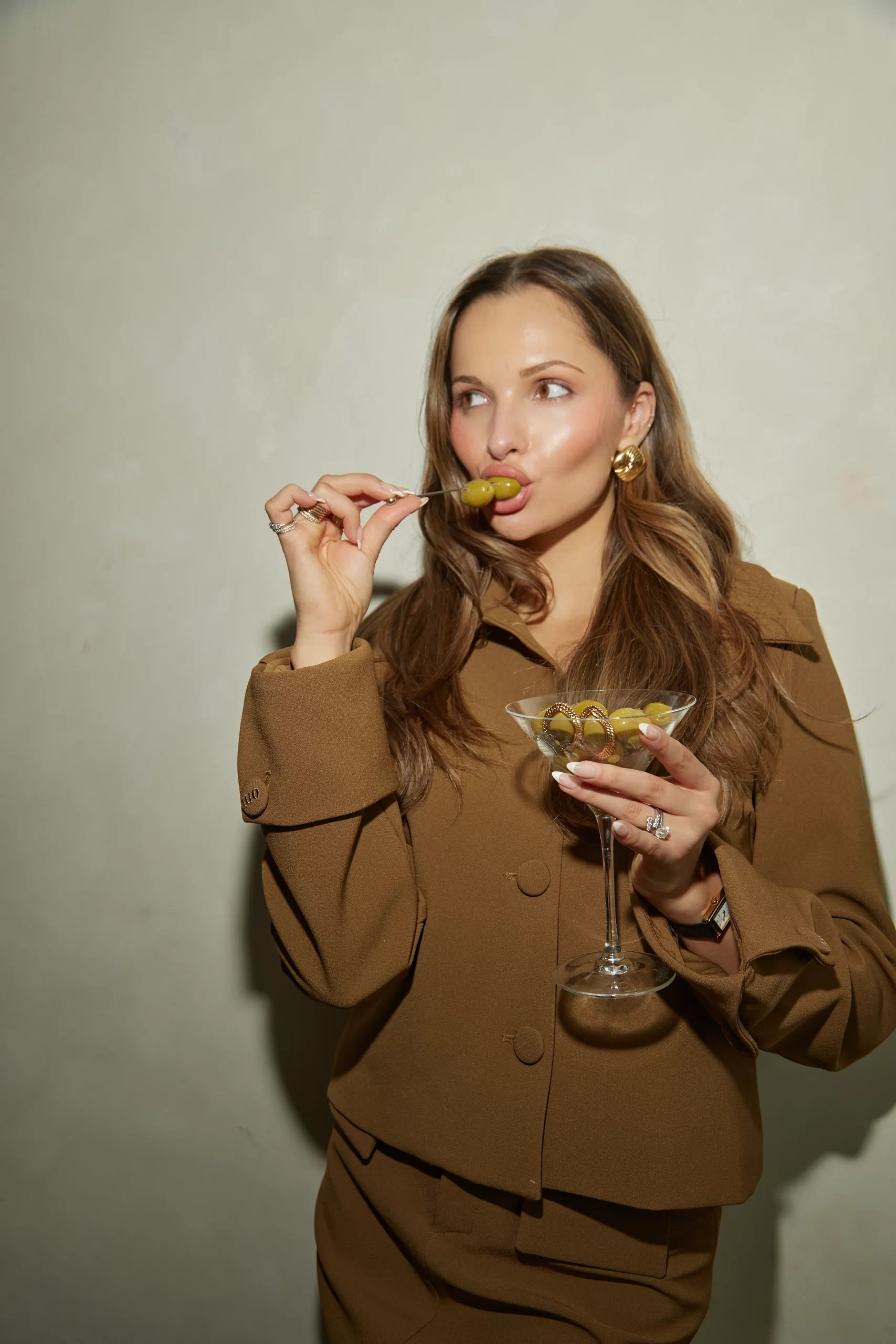 It’s all in the details for our muses. Now in our olive iteration, part of a chic three-piece, consider this your ultimate muse uniform for fall year after year. Defined by our signature tailoring and oversized lapels and embroidered OM stamp on the cuff, she is sophistication embodied for the timeless muse.