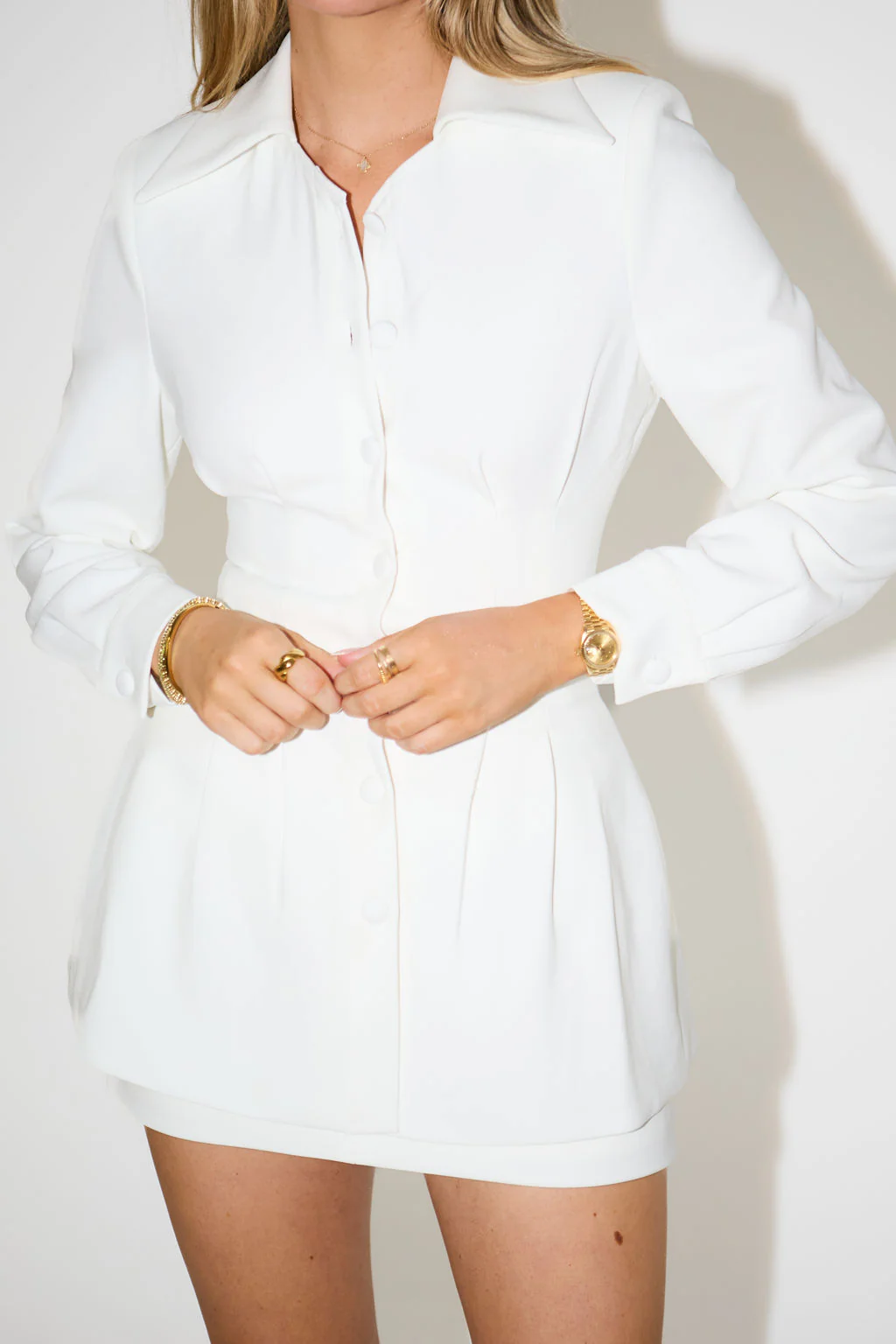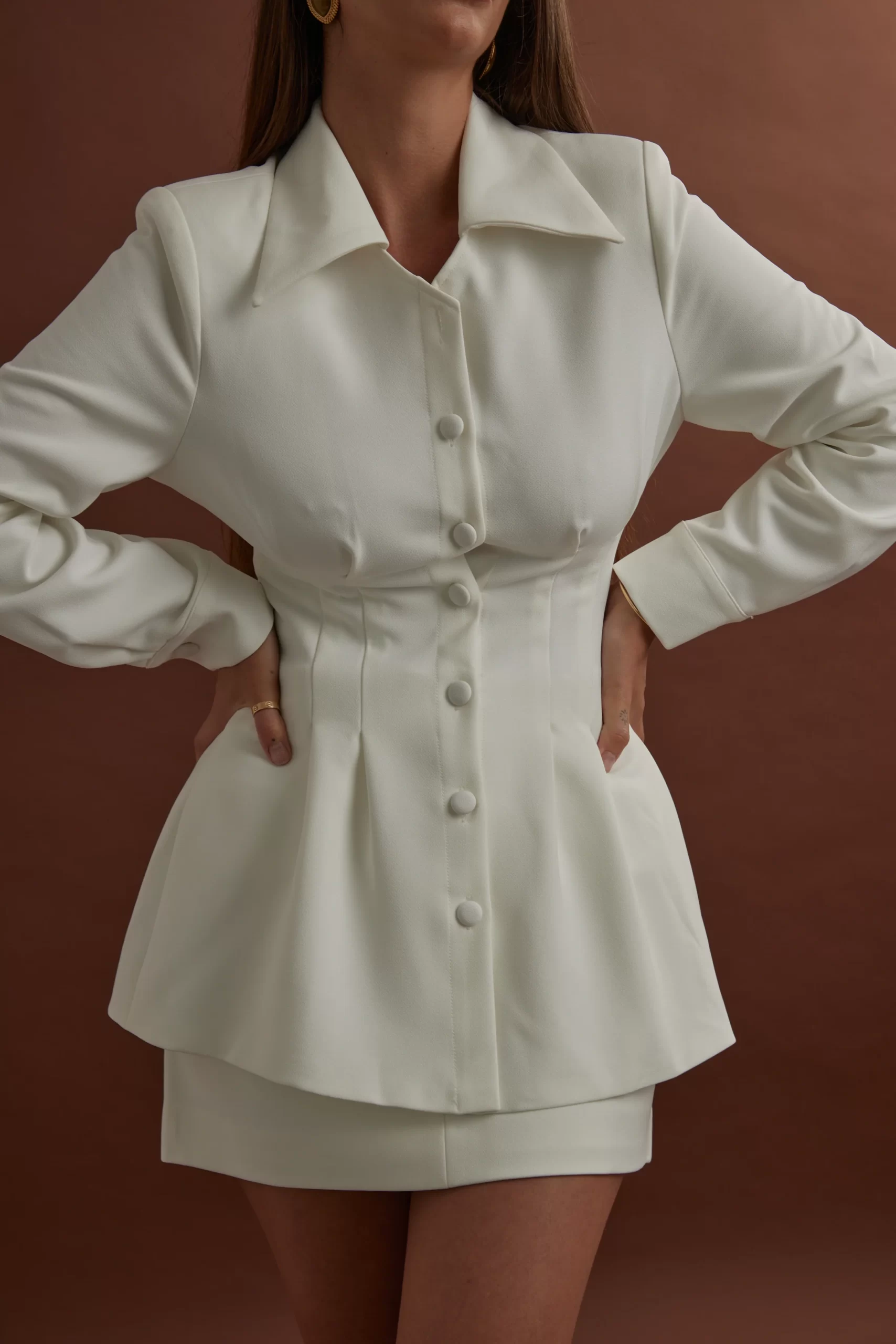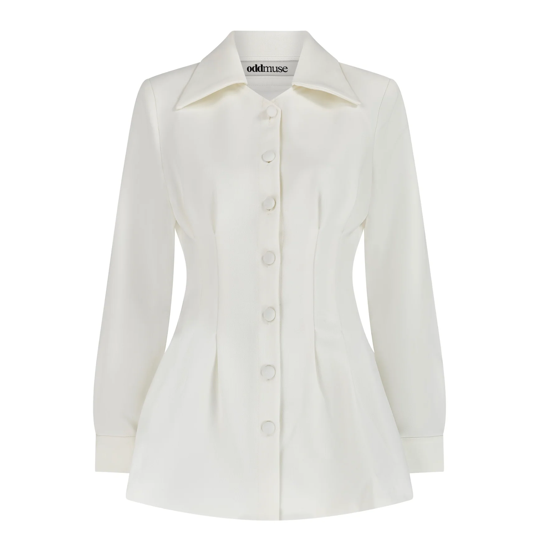 Muses, allow us to introduce you to our first shirt. Taking your crisp white everyday shirt and adding our Odd Muse stamp of elevation, this design embodies a wide spread collar topped off with a V neck detail.